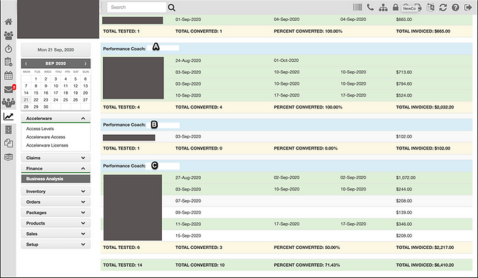 You can see here that the work of coaches A, B and C have been measured by their client conversion rate. The data that is in green shows the clients that have decided to sign a contract with us after an initial consult.