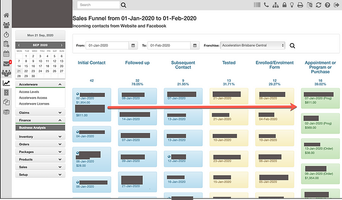 This is a more refined version of the sales funnel as it shows the best staff for converting testing clients into long term clients who continue to train at Acceleration. To make these appropriate for all types of businesses, you could link this metric to initial consultations for any service to see which staff do a good job of converting customers.